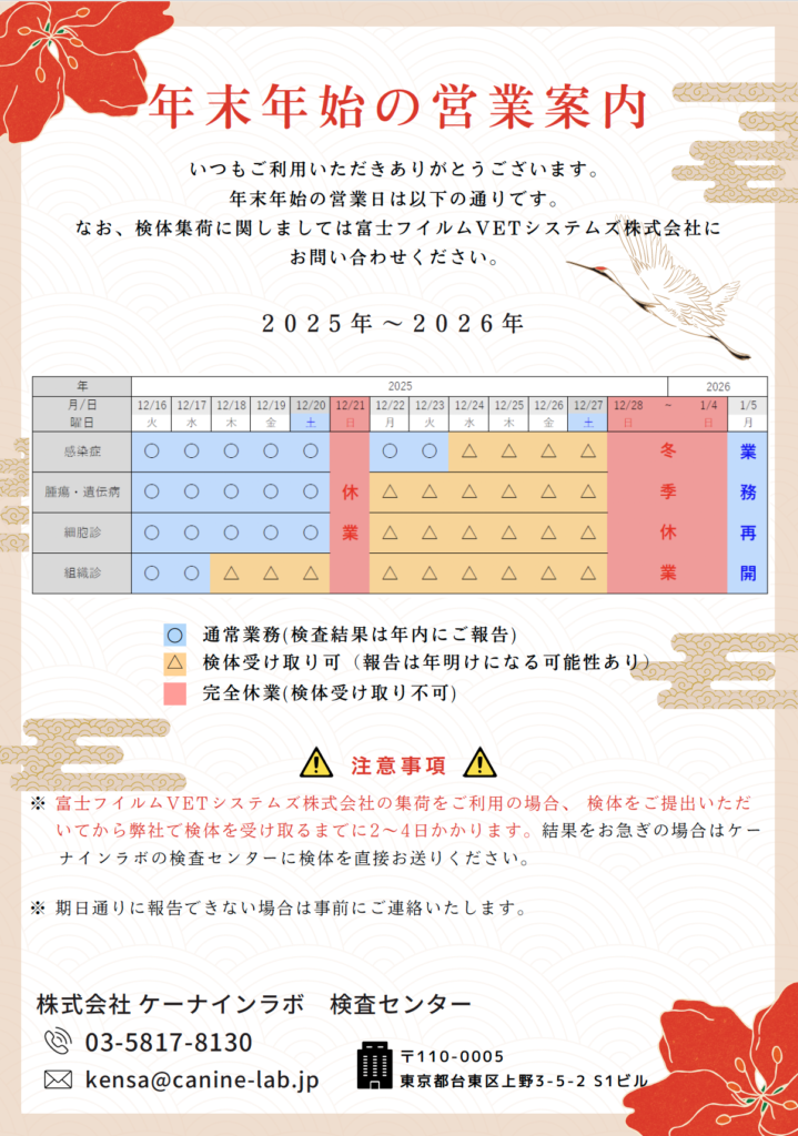 年末年始の営業案内2025.12.10 過去のお知らせ 2025年12月 (2) 2025年8月 (1) 2025年5月 (1) 2025年3月 (1) 2025年1月 (1) 2024年11月 (2) 2024年8月 (1) 2024年2月 (1) 2023年11月 (1) 2023年10月 (1) 2023年7月 (2) 2023年5月 (1) 2023年4月 (1) 2023年3月 (3) 2022年12月 (1) 2022年4月 (1) 2022年1月 (1) 2021年12月 (1) 2021年10月 (1) 2021年6月 (1) 2021年4月 (1) 2021年1月 (1) 2020年11月 (1) 2020年10月 (1) 2020年8月 (1) 2020年7月 (1) 2020年5月 (3) 2020年4月 (2) 2011年4月 (1)